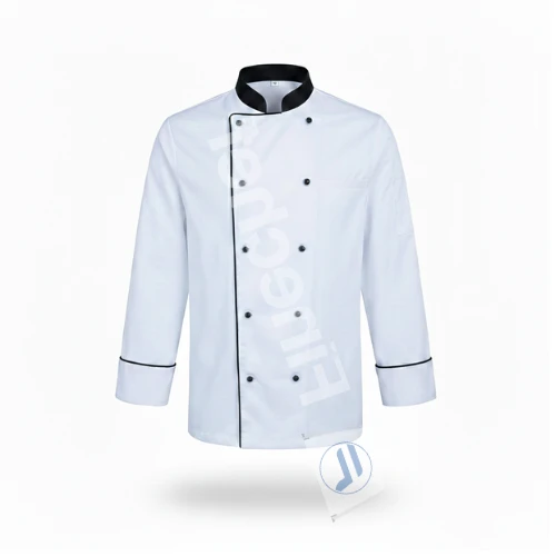 This chef jacket is built for real kitchen pace, where movement is constant and safety matters. The double-breasted front is fitted with removable stud buttons, allowing the jacket to be taken off quickly when needed during service. Long sleeves give full arm coverage, while the structured collar keeps the neckline neat in open and closed kitchens. The contrast piping adds a sharp finish and can also serve as a simple colour code for different kitchen roles, sections, or ranks. The clean white base keeps the team looking organized and professional throughout prep and service. A practical, well-thought-out chef coat for hotels and restaurants that value order, safety, and a clear kitchen identity.