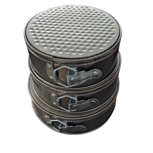The Nonstick Springform Cake Pan Set is designed to make baking cakes and cheesecakes easy and convenient. The pans feature a removable base and a secure latch that allows you to release cakes smoothly without damaging their shape. The nonstick surface helps prevent food from sticking and makes cleaning easier after baking. This set includes medium to large size cake pans, making it suitable for baking different cake sizes for home kitchens, bakeries, restaurants, and dessert shops. It is ideal for cheesecakes, sponge cakes, layered cakes, and other baked desserts. |