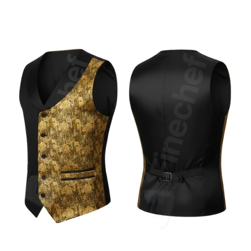 This tuxedo half coat is designed for hotel staff who work in front-facing service roles where presentation matters. Worn as a waistcoat, it adds a sharp, formal layer over a service shirt for waiters, stewards, and hospitality supervisors. The slim, tailored shape helps the uniform stay neat while allowing easy movement during service. A buttoned front and shaped hem give it a classic tuxedo finish suited for hotel restaurants, lounges, and event service. The patterned front panel adds visual depth, balanced by a plain back for a clean overall look. An adjustable back strap allows the fit to be refined for long, busy shifts.