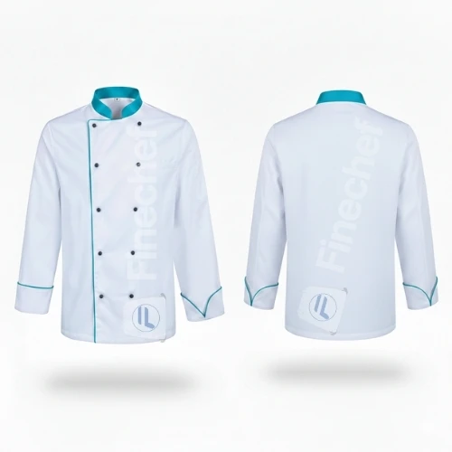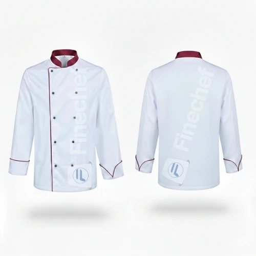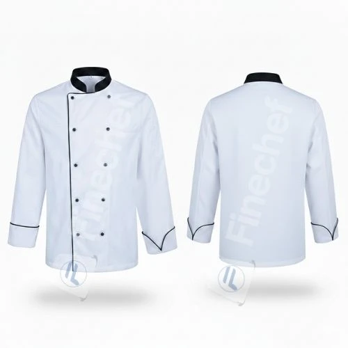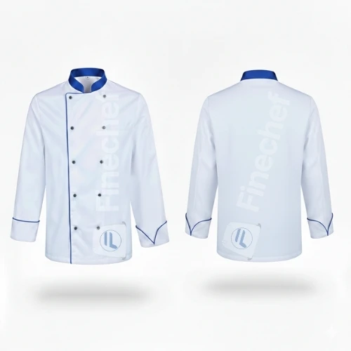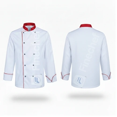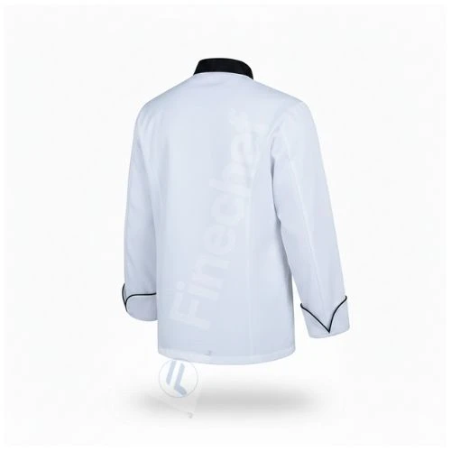 This chef jacket is built for real kitchen pace, where movement is constant and safety matters. The double-breasted front is fitted with removable stud buttons, allowing the jacket to be taken off quickly when needed during service. Long sleeves give full arm coverage, while the structured collar keeps the neckline neat in open and closed kitchens. The contrast piping adds a sharp finish and can also serve as a simple colour code for different kitchen roles, sections, or ranks. The clean white base keeps the team looking organized and professional throughout prep and service. A practical, well-thought-out chef coat for hotels and restaurants that value order, safety, and a clear kitchen identity.