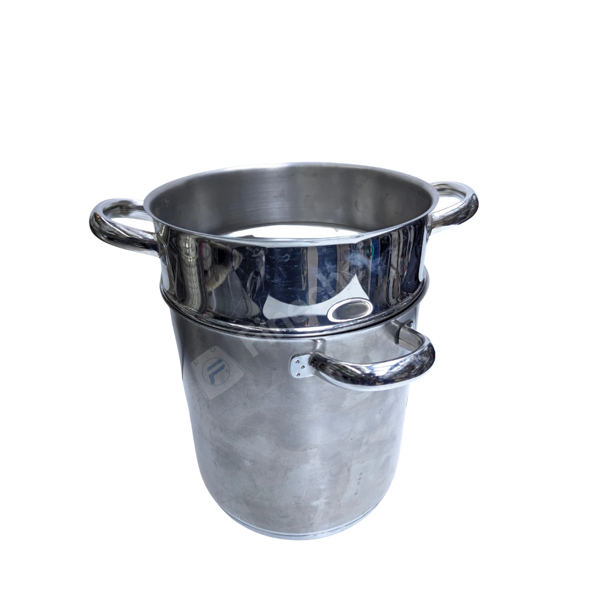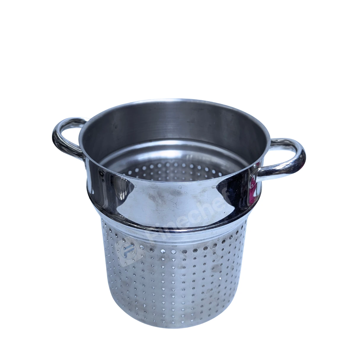 features a perforated steamer insert and a solid base pot for boiling water. It’s