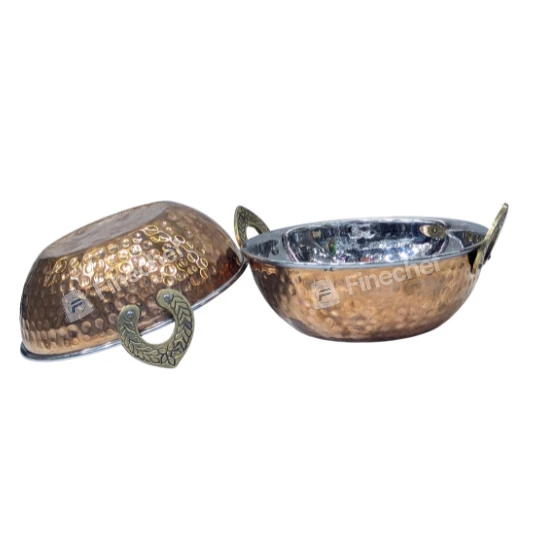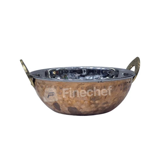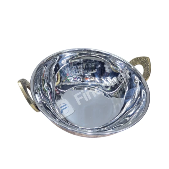 The bowl is shallow and round, making it ideal for serving curries, vegetables, snacks, sauces, and table settings. The decorative brass-tone handles offer a secure grip and add character to the design. It works well for home use, catering setups, and restaurants that want attractive and durable serving ware.